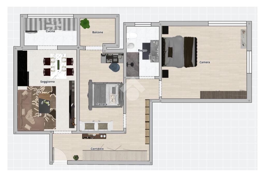 L'immobile è composto da ingresso, soggiorno con angolo cottura, disimpegno, bagno, camera matrimoniale e camera singola con balcone.